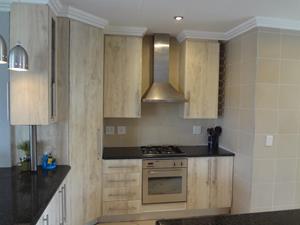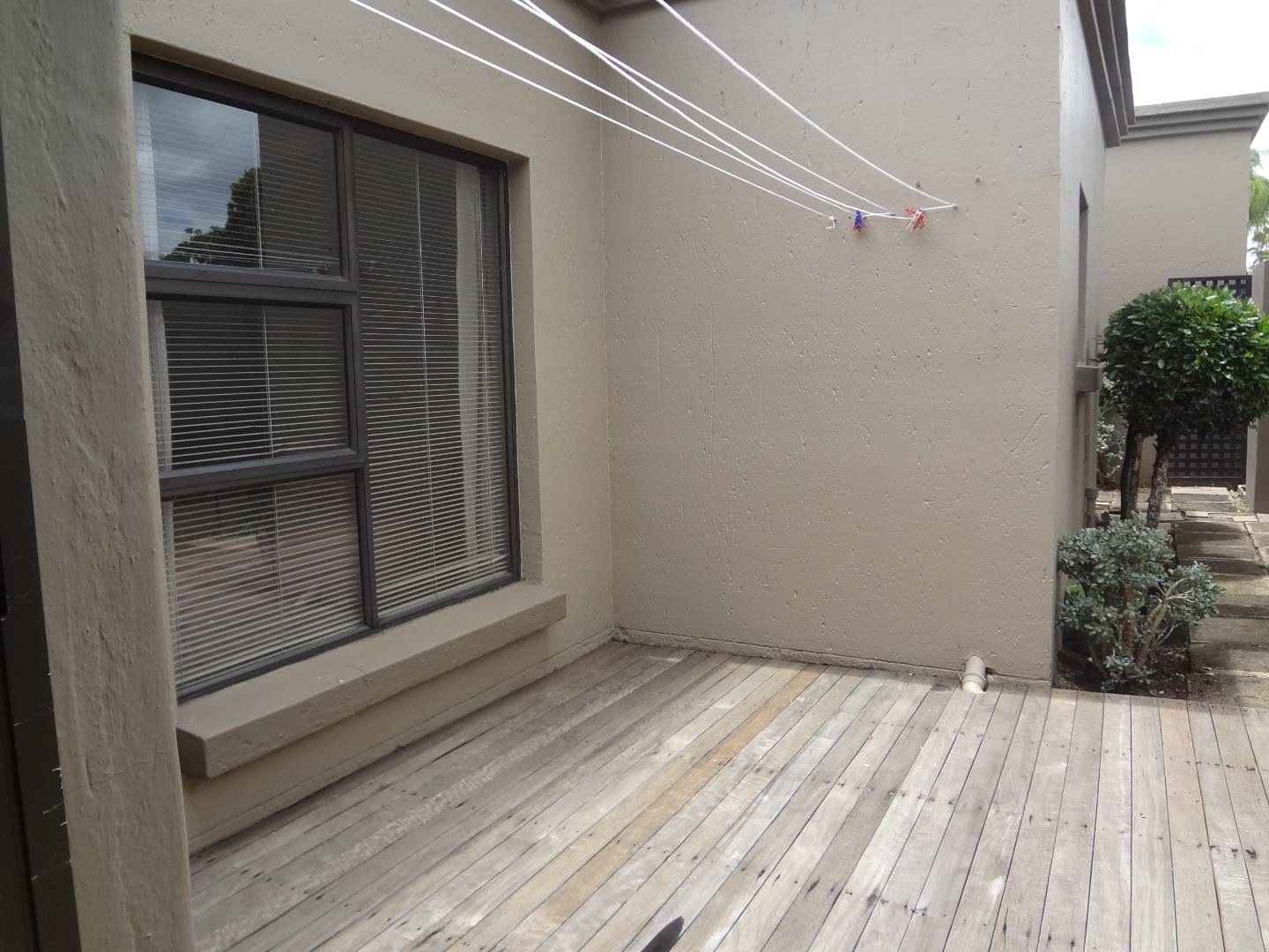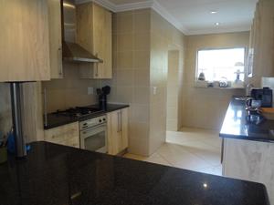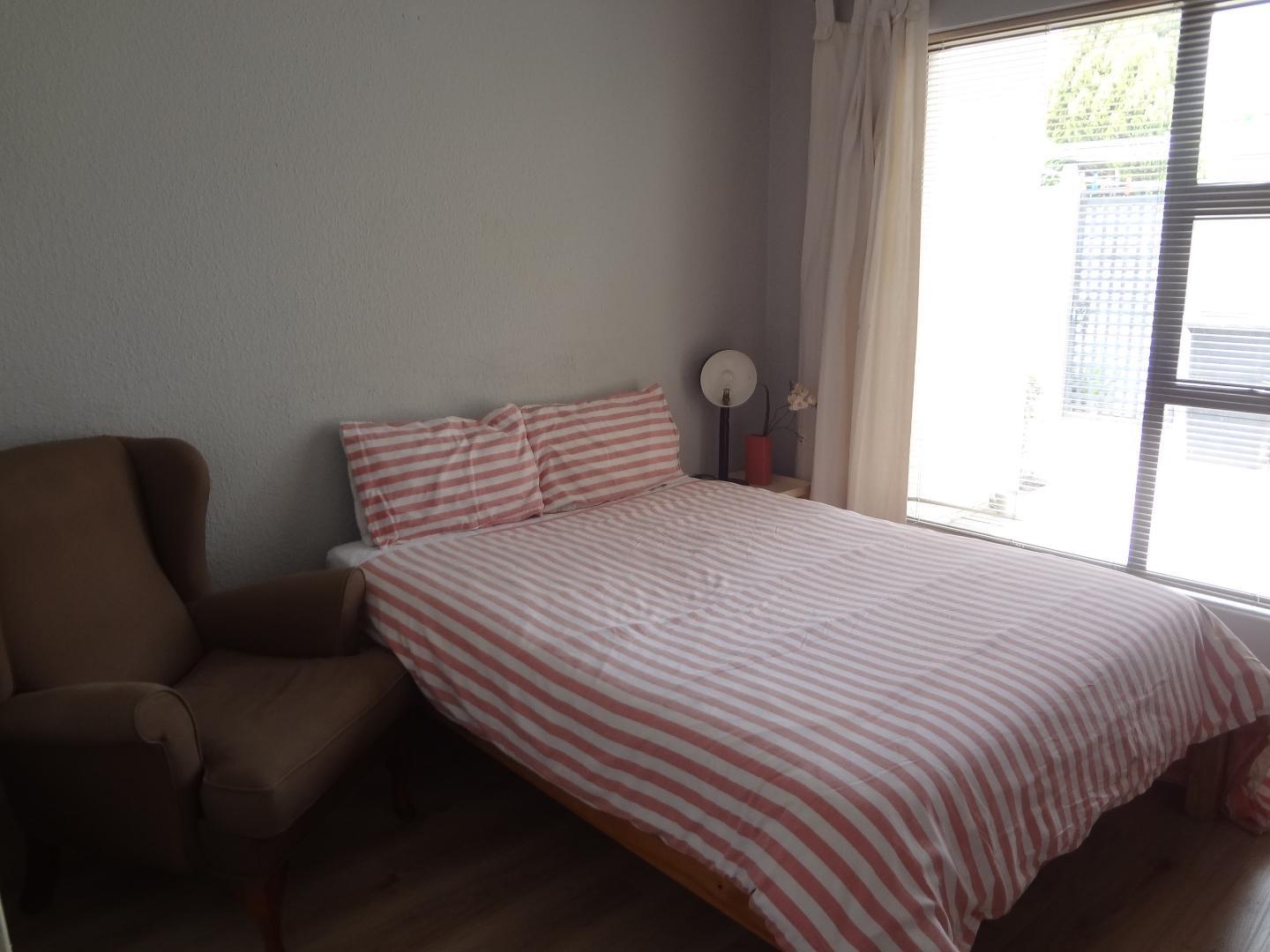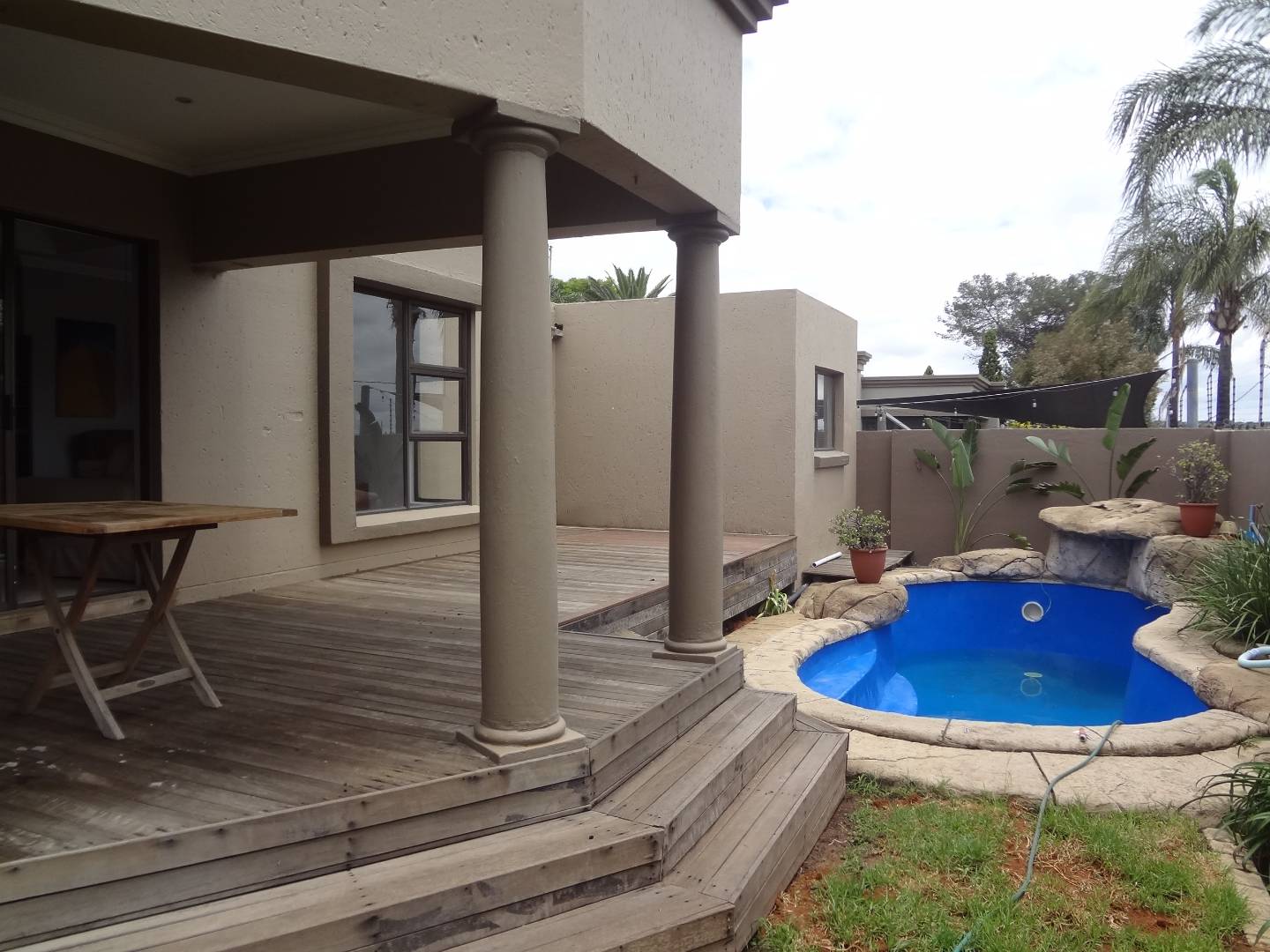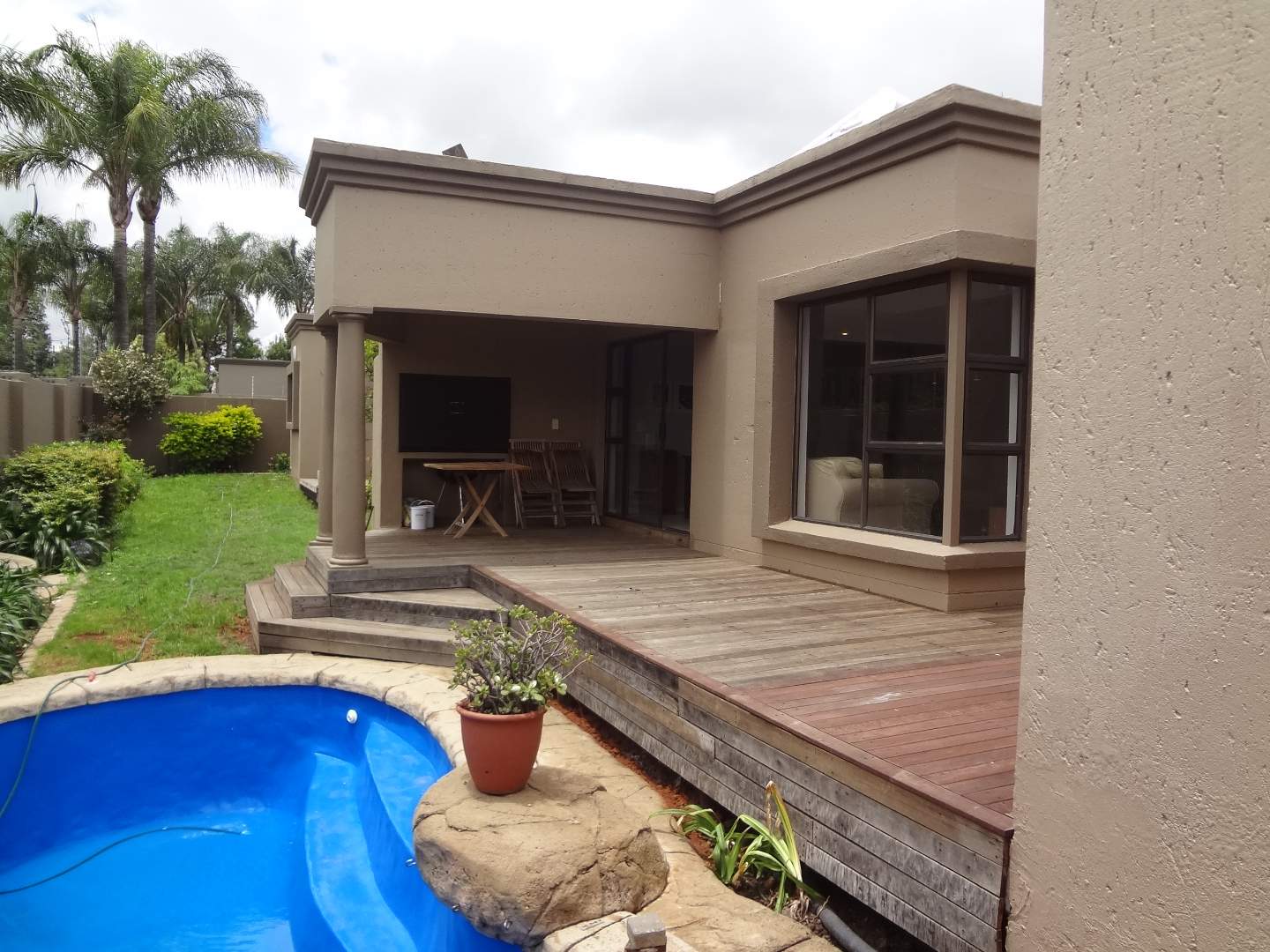 Step into the open-plan dining and lounge area, an ideal space for entertaining guests or relaxing with family. The heart of the home boasts a lovely, neat kitchen equipped with a gas stove, ample cupboards, a breakfast nook, and elegant granite countertops, and a linen cupboard conveniently located in the hallway. This culinary haven is complemented by a convenient scullery, offering space for a washing machine and fridge, and leading out to a charming decked courtyard and wrap-around garden.