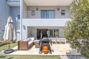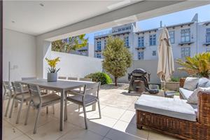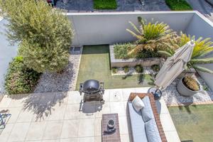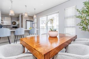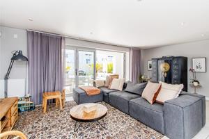 Tiled lounge and dining room with stacking doors opening onto a covered patio and landscaped garden.