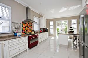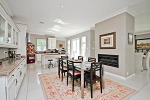 The gourmet kitchen is a chef's delight, equipped with state-of-the-art appliances and a breakfast bar perfect for casual dining. Its open-plan design effortlessly connects to the dining and living areas, creating an ideal setting for entertaining guests.