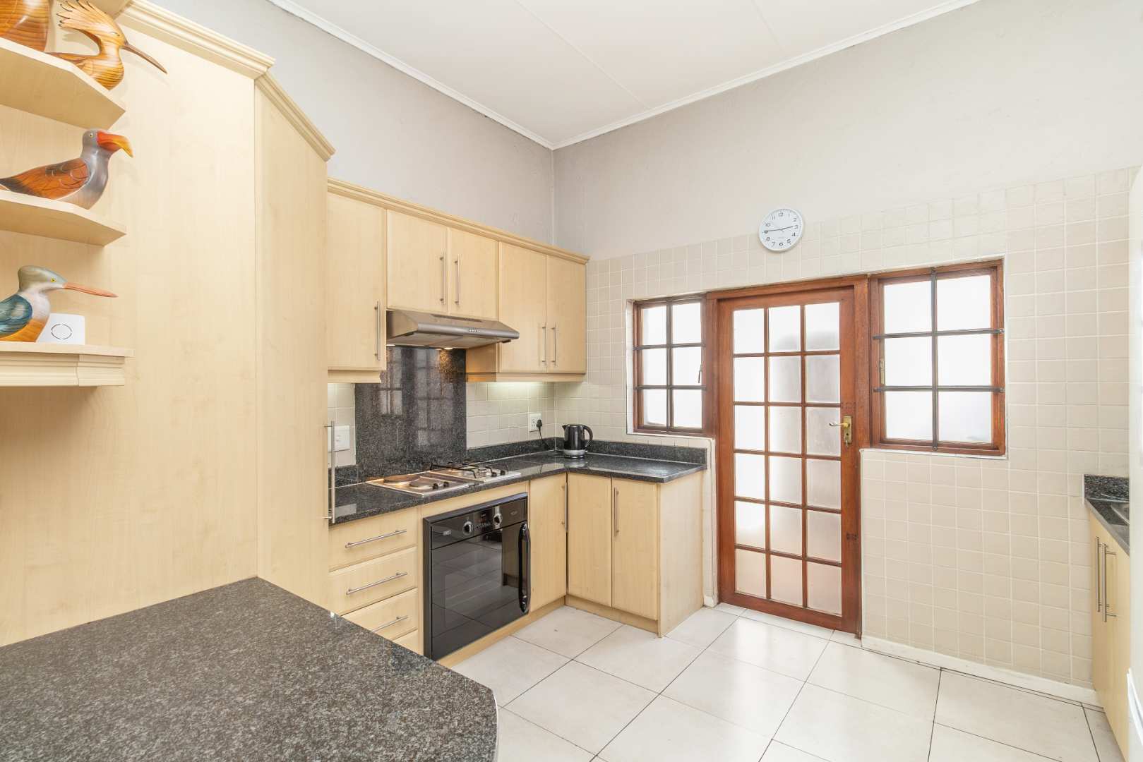 The kitchen is thoughtfully designed, featuring ample cupboard space and elegant granite countertops. It is equipped with a space for one appliance, a single fridge, double sink, under-counter oven with a dual gas and electric hob, and an extractor fan. Additionally, a large corner pantry unit provides extra storage. Adjacent to the kitchen is an external utility yard with a foldable wash line and external sink, which connects to the automated garage. The garage is equipped to house your washing machine and tumble dryer.