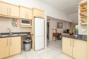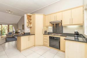 The kitchen is thoughtfully designed, featuring ample cupboard space and elegant granite countertops. It is equipped with a space for one appliance, a single fridge, double sink, under-counter oven with a dual gas and electric hob, and an extractor fan. Additionally, a large corner pantry unit provides extra storage. Adjacent to the kitchen is an external utility yard with a foldable wash line and external sink, which connects to the automated garage. The garage is equipped to house your washing machine and tumble dryer.
