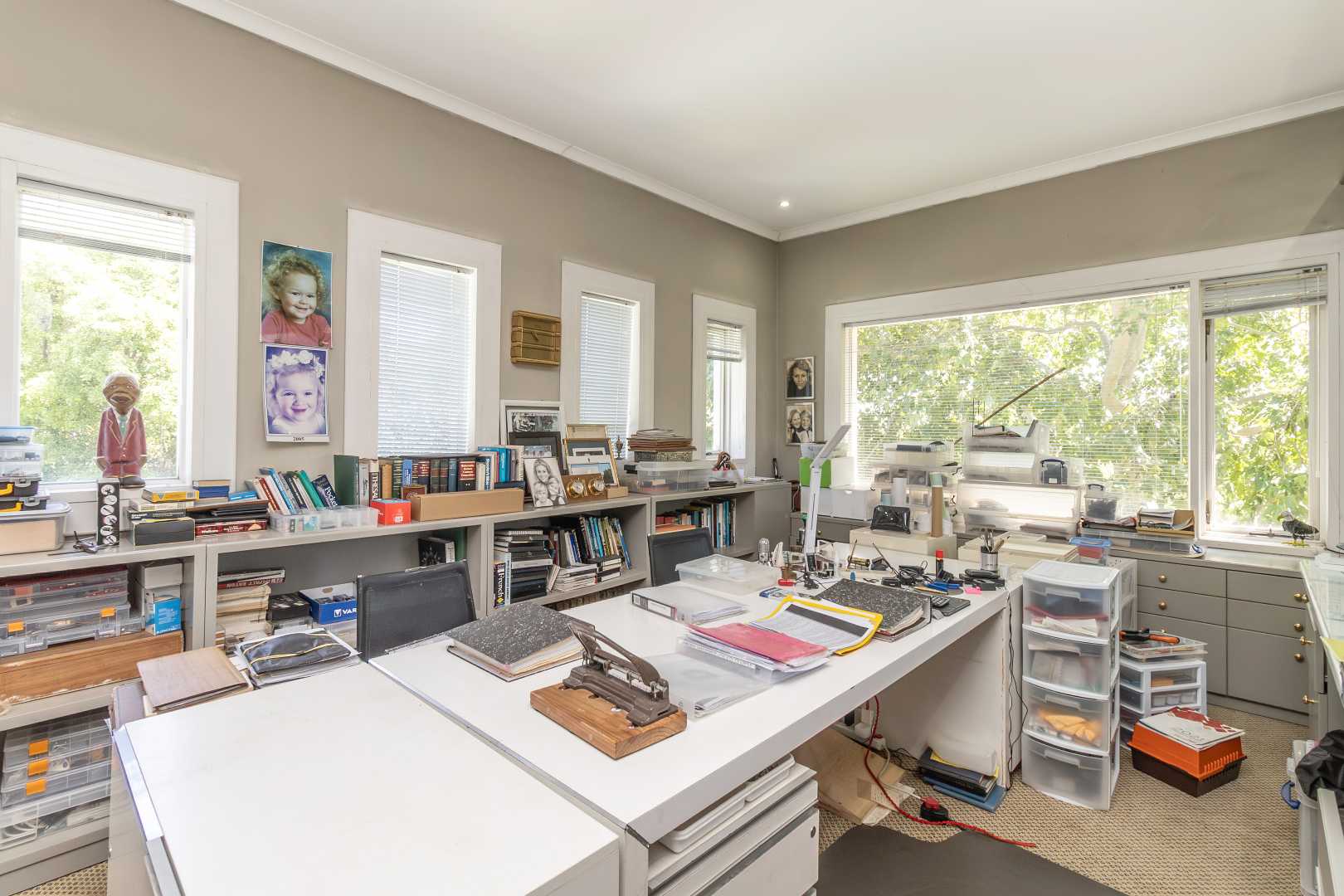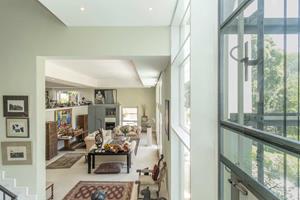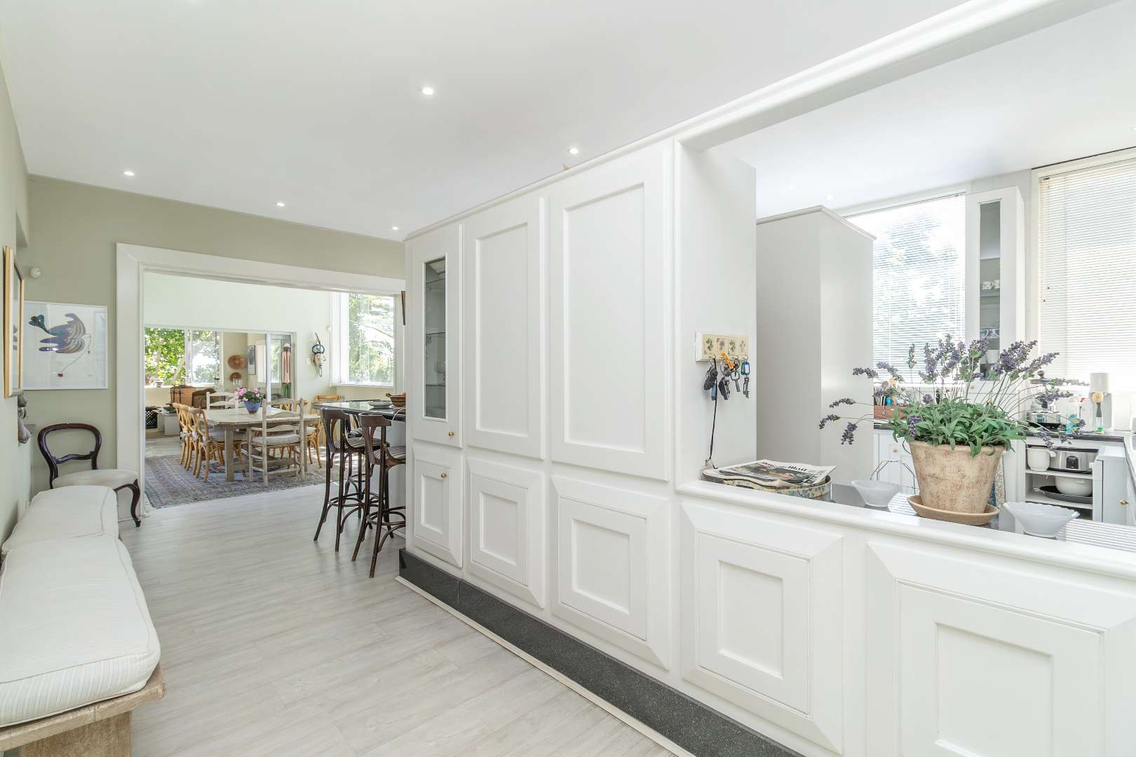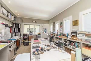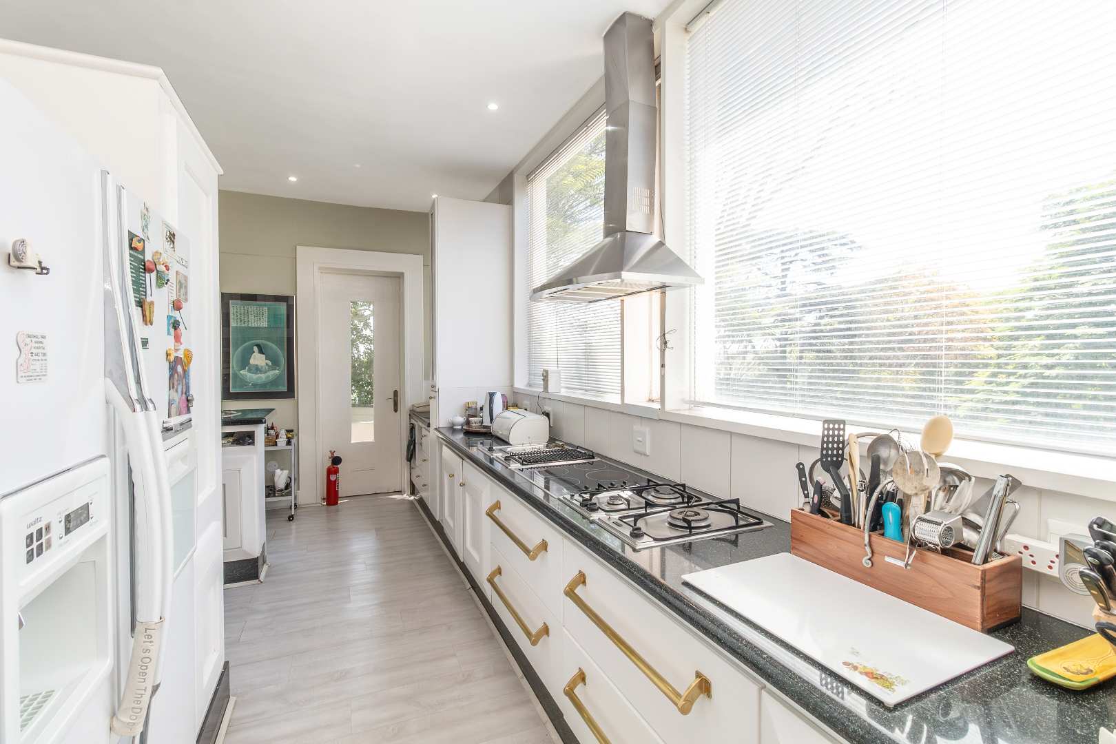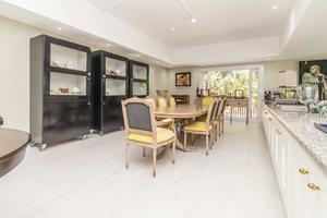 The ground floor features a self-contained three-bedroom, two-bathroom apartment or staff suite, a work-from-home office, and garage space accommodating up to six vehicles. The reception and living areas, as well as the upstairs bedrooms and bathrooms, are equipped with Hydroflow underfloor heating powered by solar and heat pumps.
