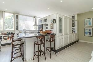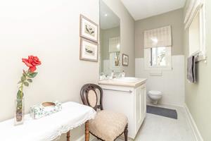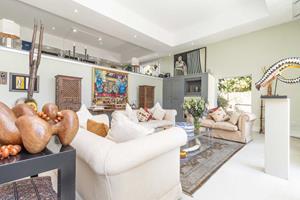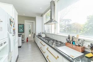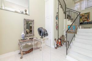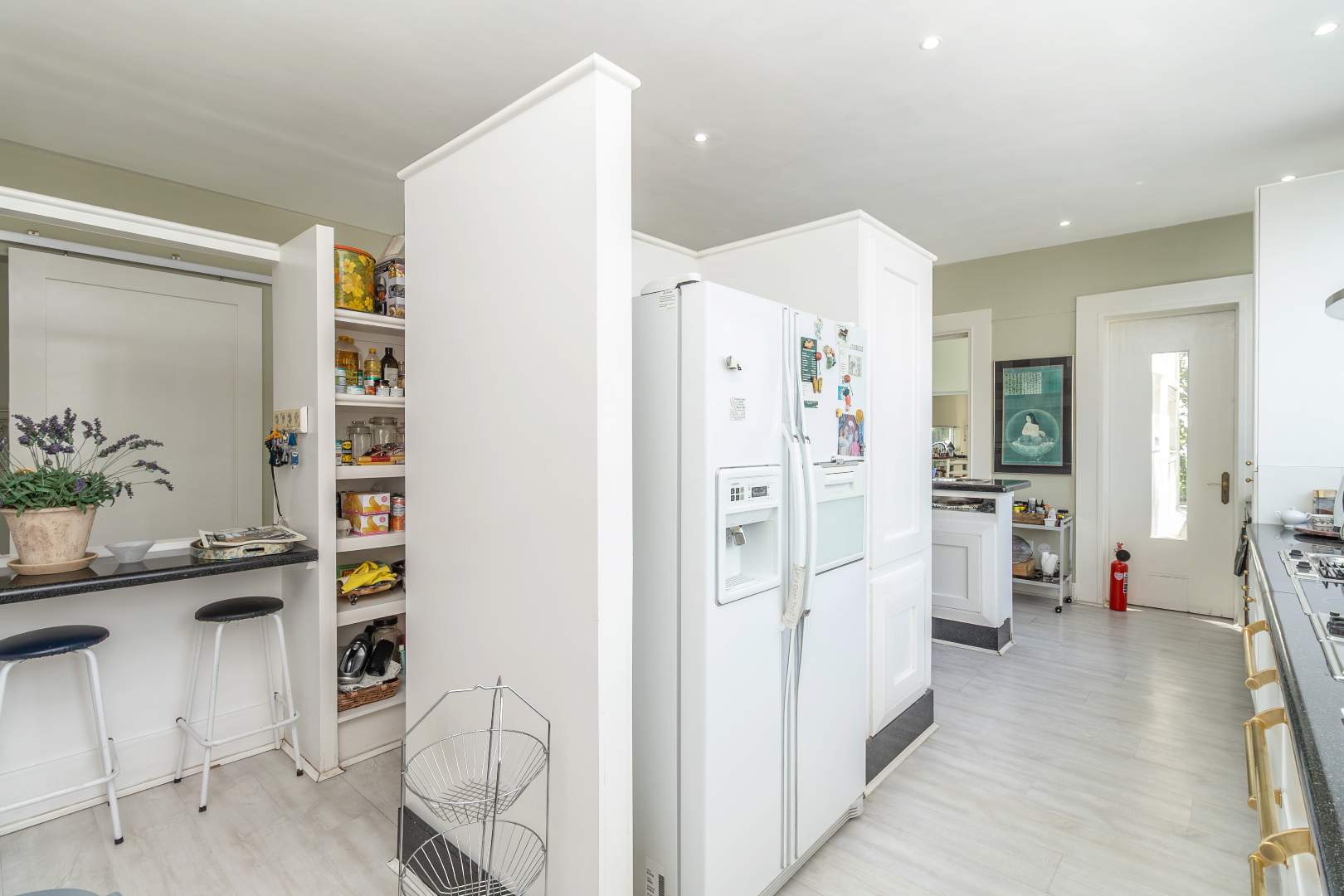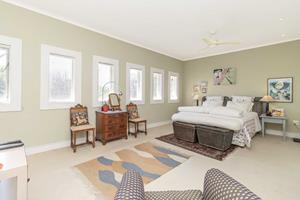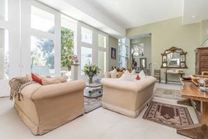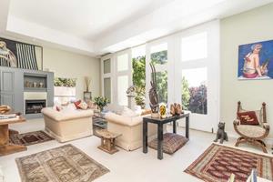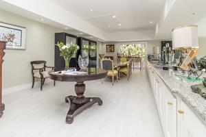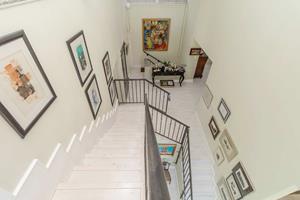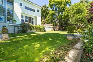 A secure, gated exterior staircase leads to the entrance and a baronial gallery that overlooks the expansive living/lounge area, complete with a cozy fireplace. Stacking doors open onto the exceptional terraced gardens, which boast an extra-length lap pool, summer patios, rolling lawns, and a tranquil koi pond—all walled for privacy. The well-equipped chef’s kitchen flows into the breakfast room, a conservatory-style family room, and an enclosed terrace. A formal dining room and guest cloakroom complete the main living spaces.