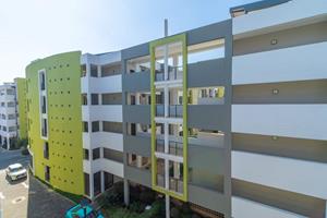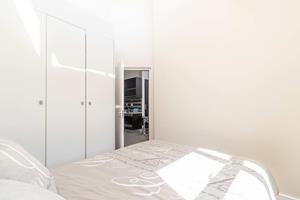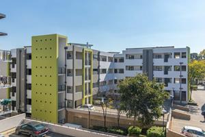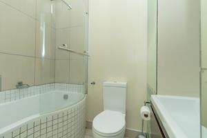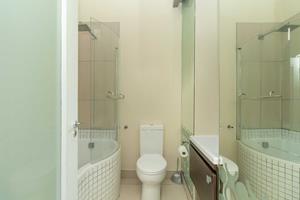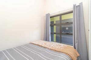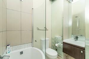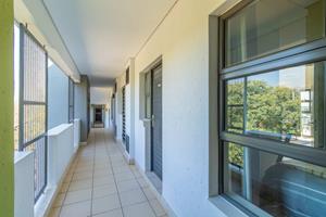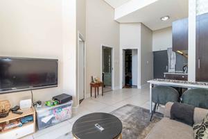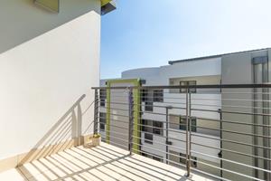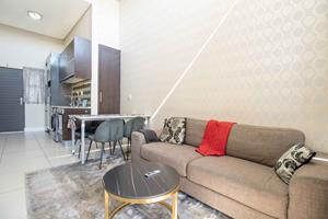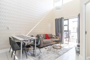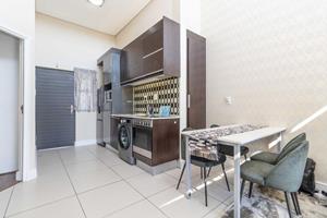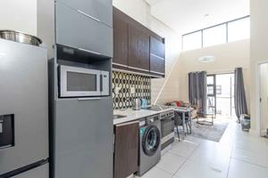 The unit offers open-plan living, with wooden flooring throughout, except in the kitchen and bathroom. The kitchen is neat and well-fitted, with ample cupboards and space for a single-door fridge and one under-counter appliance. The double-volume dining and lounge area features a glass sliding door leading out onto a covered balcony.