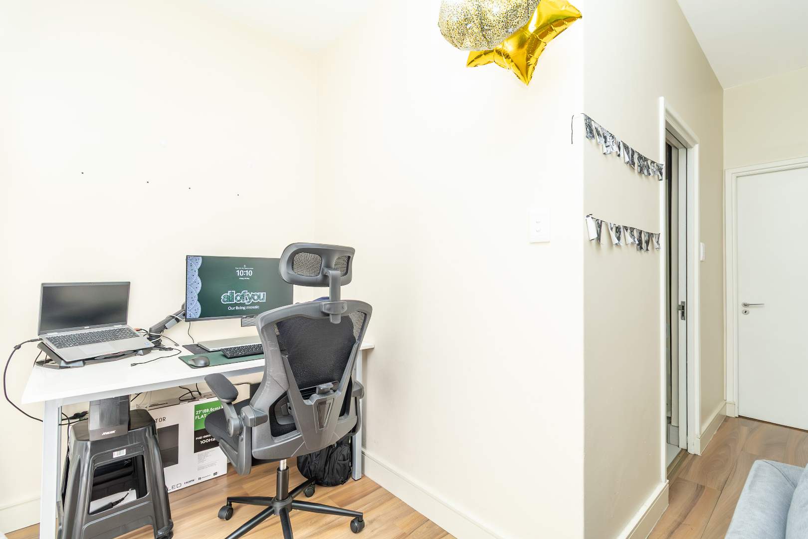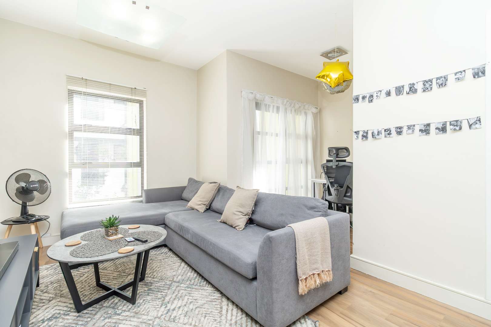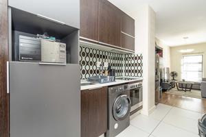 The unit offers open-plan living. Wooden flooring throughout the unit, except for the kitchen and bathroom. A neat and well-fitted kitchen with fitted with ample cupboards and space for a single door fridge and one under-counter appliance. Dining and lounge area, a study nook, as well as a glass sliding door leading out onto a coved balcony.