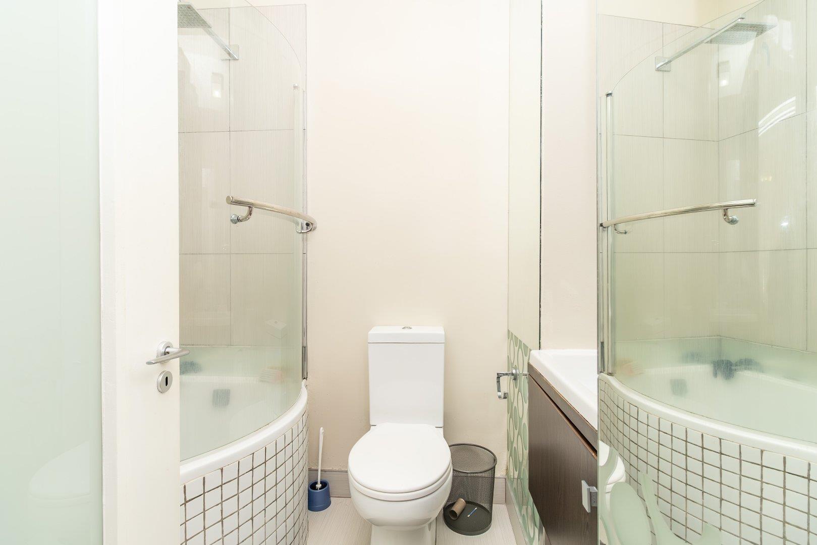 A spacious, light and sunny bedroom fitted with modern built-in cupboards and a full bathroom with a bathtub, shower, toilet and a basin.
