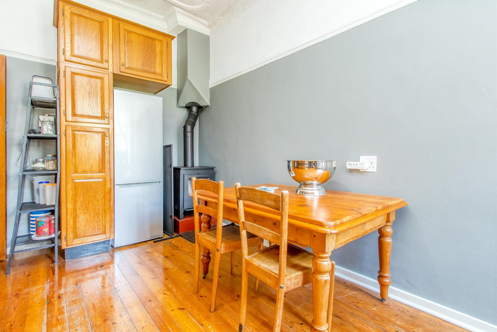 Country styled kitchen enriched with wooden floors and wood burning fireplace.
