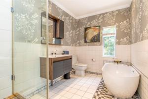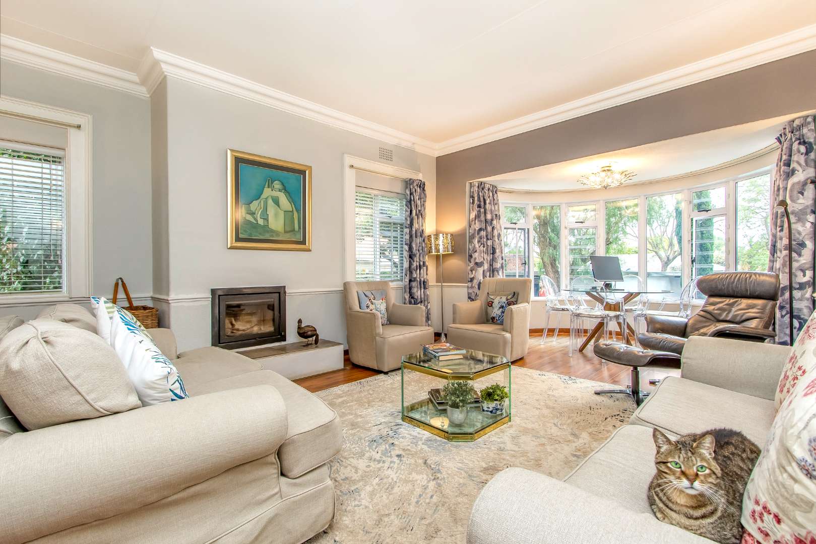 This sun-filled home welcomes you into a pristine, tiled entrance hall, flowing to the elegant lounge with a charming bay window, laminate wood flooring and fitted fire-place. The entire home has brushed aluminum frames and double glazed windows throughout. An expansive dining area with stacking doors between an additional family room/bar area. Double doors opening onto an entertainers deck with roller blinds, overlooking a beautifully maintained and well established garden with an inviting swimming pool.