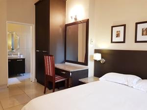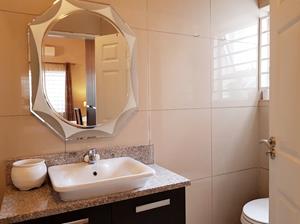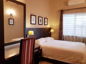 The spacious air-conditioned bedroom has a Queen size bed, dressing table, ample built-in cupboards and has a modern en-suite bathroom equipped with a shower.