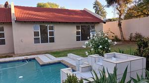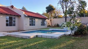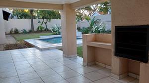 As you step inside, you'll be greeted by spacious open-plan living rooms that seamlessly flow onto a covered patio, complete with a built-in braai. This space is perfect for entertaining or simply enjoying relaxed family evenings. The lovely garden is a true highlight, featuring a sparkling pool and a boma with seating around a fire pit, creating a warm and inviting outdoor environment.