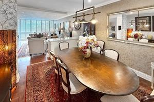 The open-plan dining room is truly a highlight, featuring glamorous lighting that sets the stage for memorable dinners and gatherings. Adjacent to the dining area is the sleek, fully equipped kitchen, which comes complete with a fridge, washing machine, and dishwasher, ensuring all your culinary needs are met.