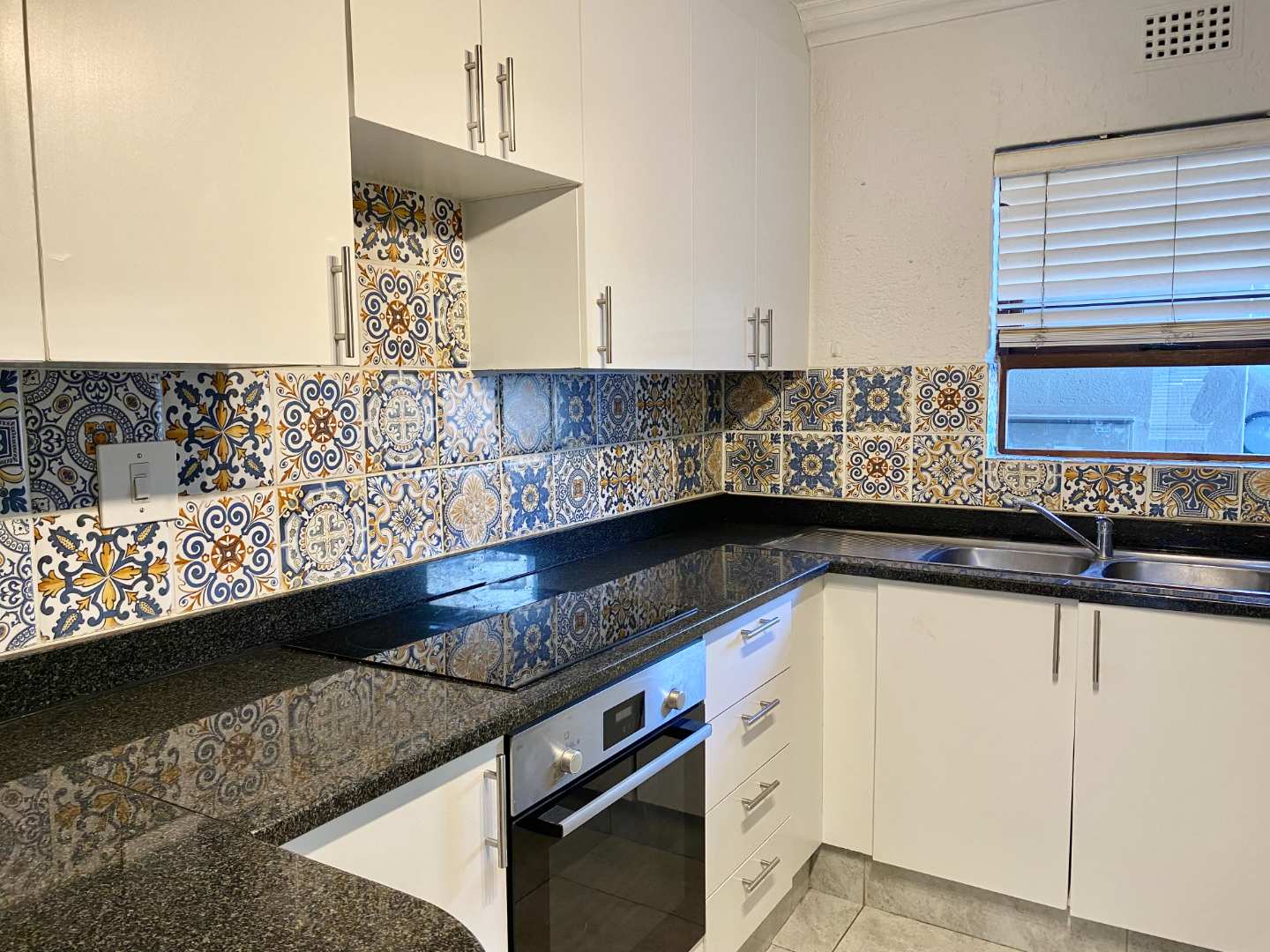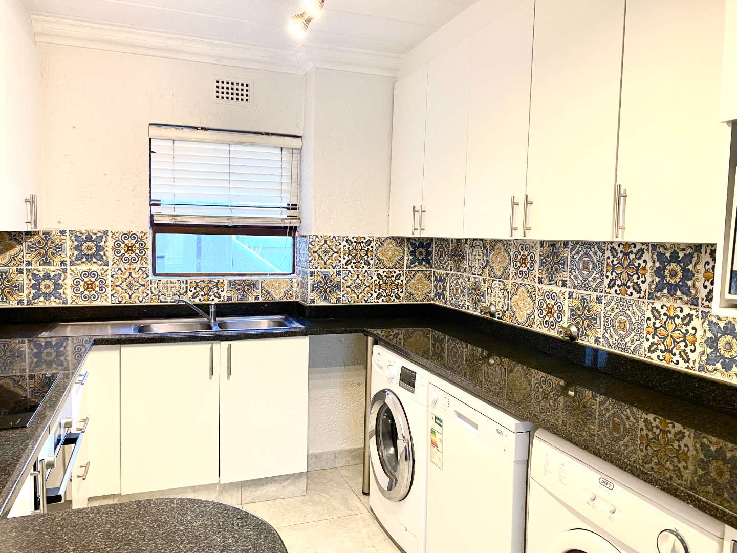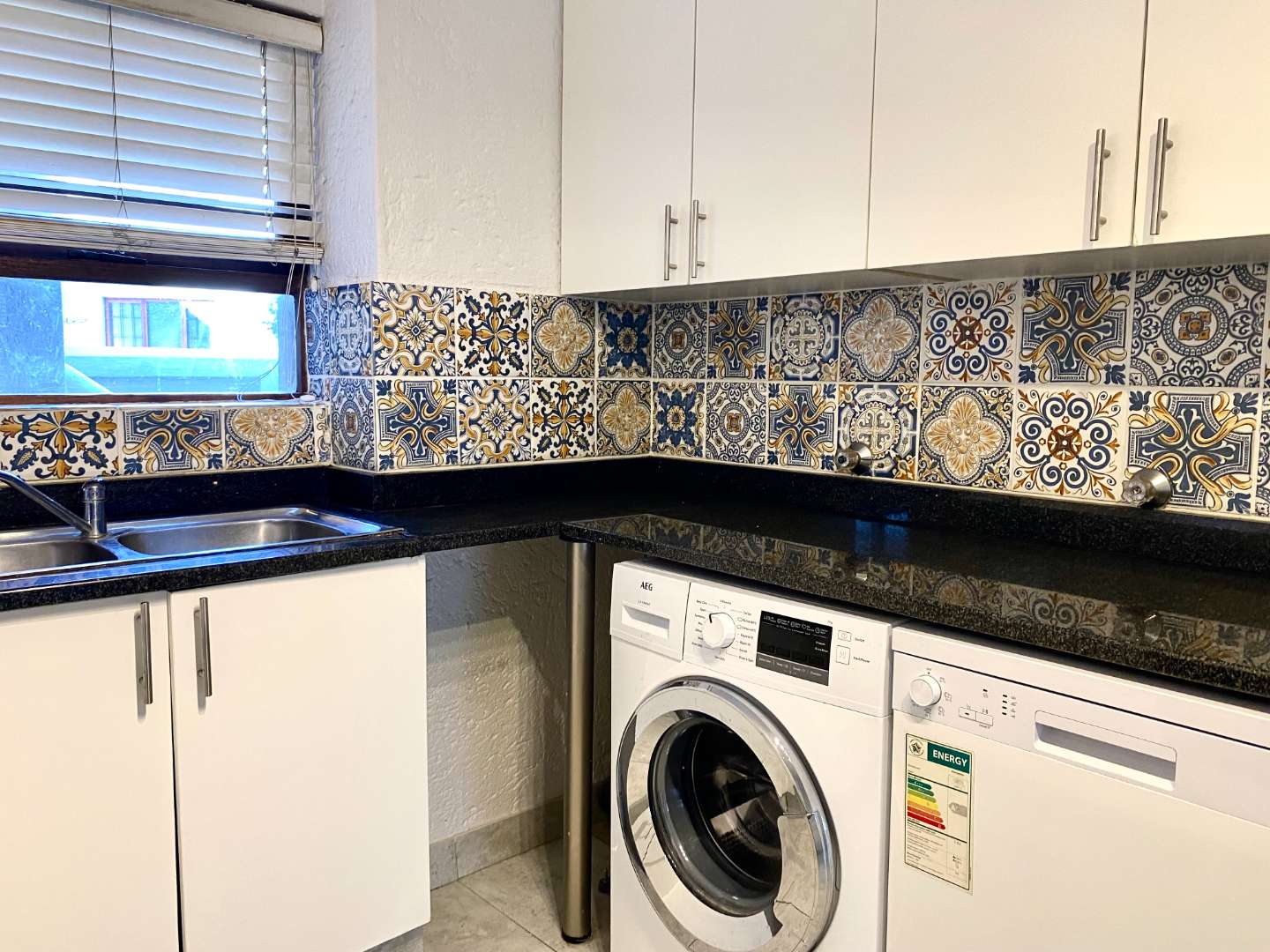 Step inside and be impressed by the tiled flooring that spans the living areas, kitchen, and bathrooms, providing a sleek and contemporary feel. The kitchen is a chef's delight, featuring granite countertops, ample cabinetry, and space for three under-counter appliances. For your convenience, a washing machine and dishwasher are included with the unit.