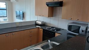 This spacious apartment boasts two generously sized bedrooms, each featuring built-in cupboards and stylish en-suite bathrooms, providing ample space and privacy for residents.