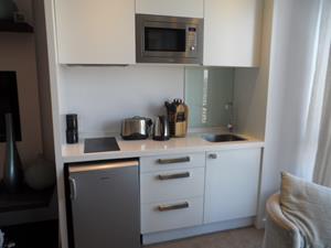 Fully equipped Ultra Modern Kitchen with Microwave, Bar Fridge ,and 2 plate glass top Stove