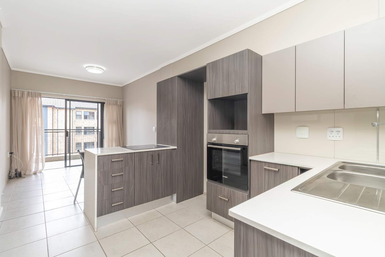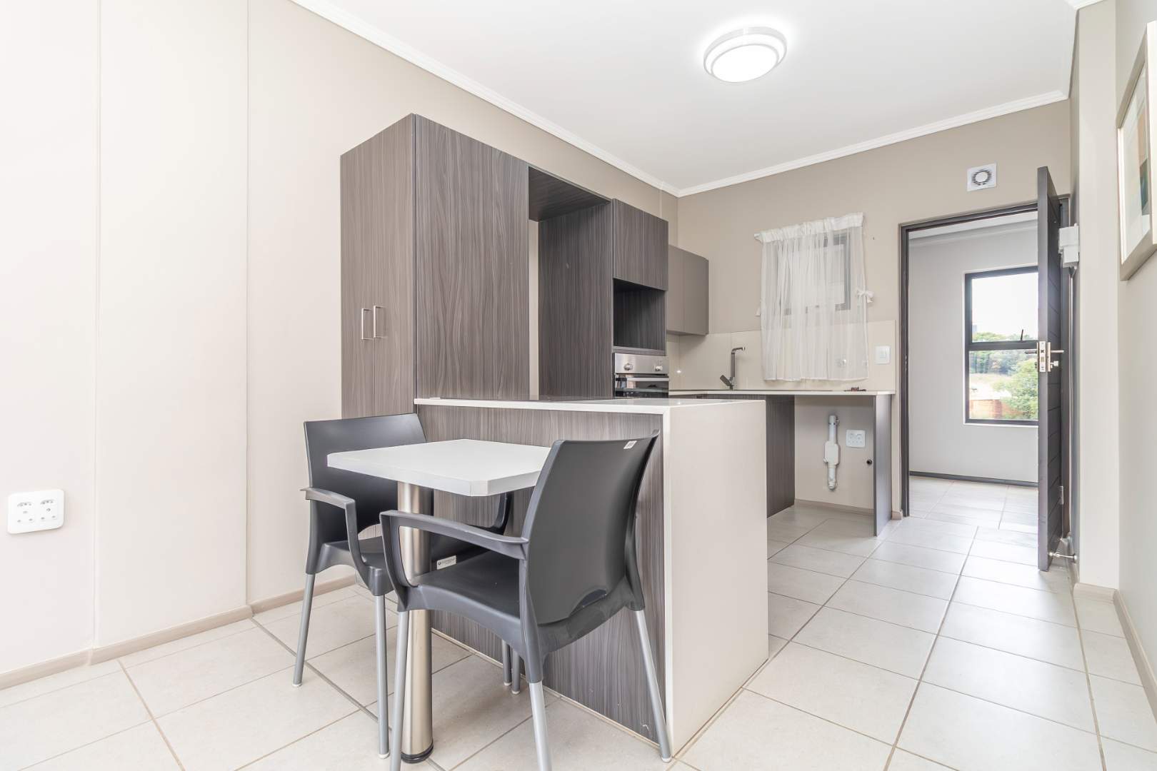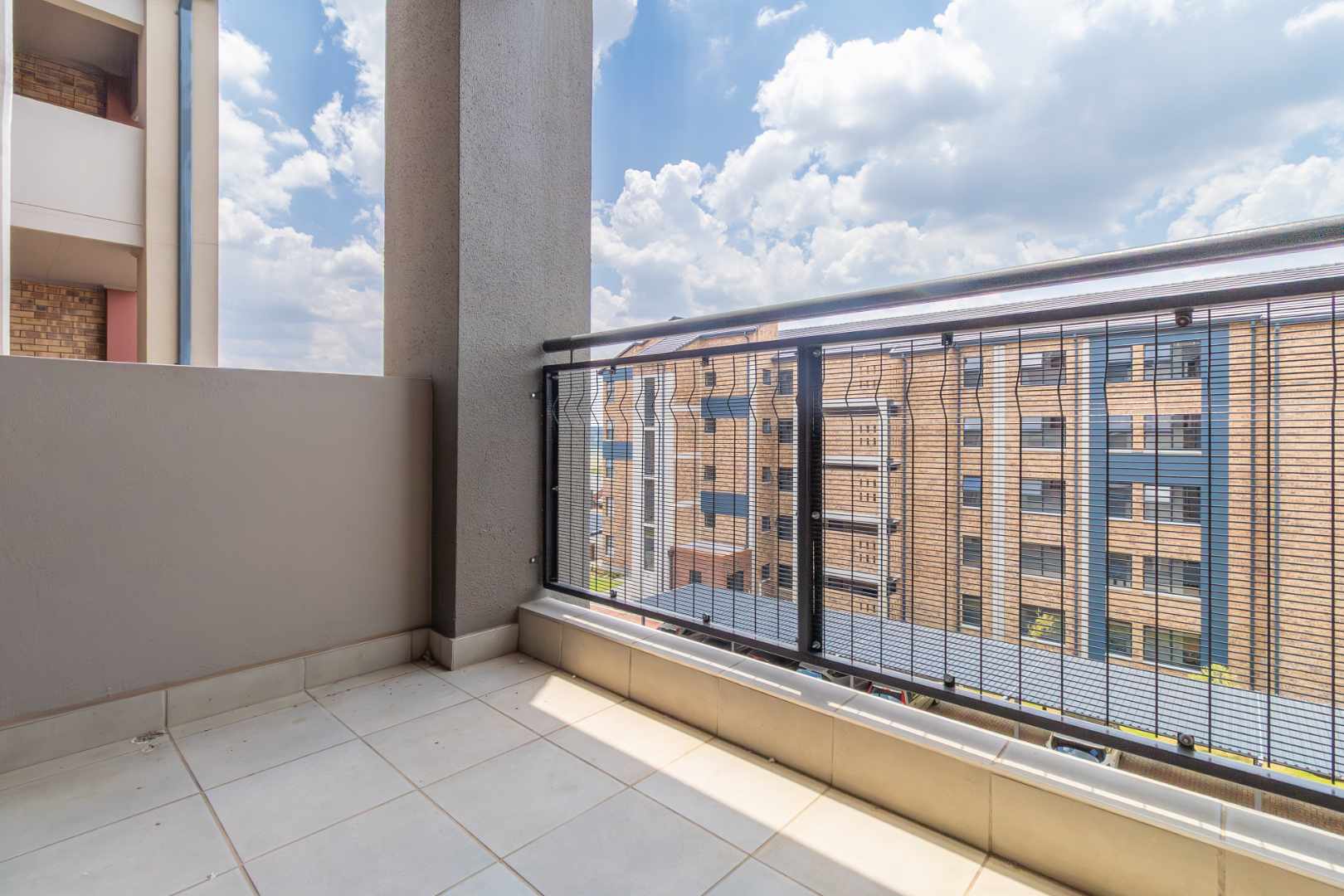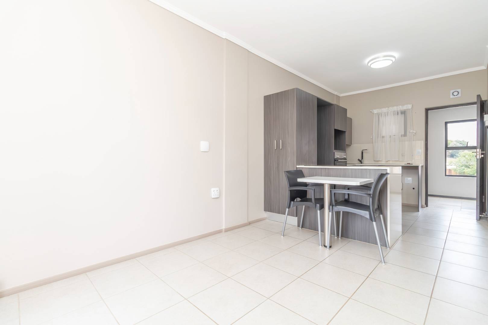 Situated on the 3rd floor and accessible via a lift, this modern apartment has a spacious open-plan living area with elegant tiling throughout. The living area opens onto a balcony through sliding doors, offering views that enhance the sense of serenity. The eat-in kitchen is thoughtfully designed with space for a single fridge and a plumbed appliance, making it both functional and stylish.