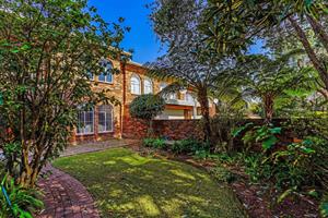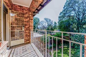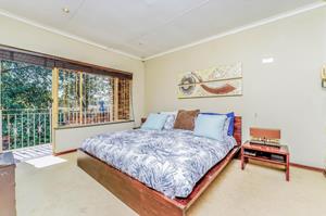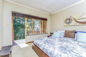 The upper level houses three carpeted bedrooms, each with built-in cupboards. The main bedroom features a balcony that offers stunning views of the lush, mature trees and shrubs, creating a tranquil retreat. There are two bathrooms; the main en-suite includes both a shower and bath, while the shared bathroom features a bath.