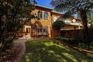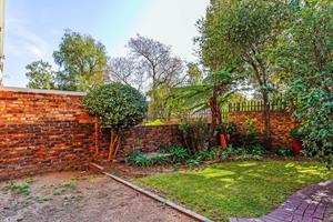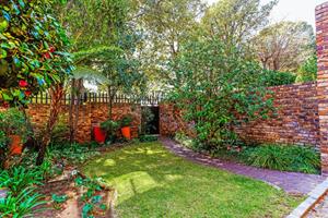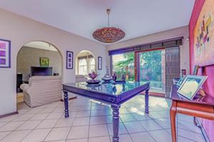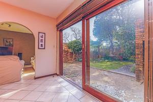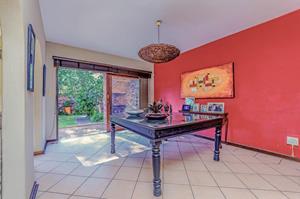 The dining room, complete with sliding doors, opens onto an uncovered patio area equipped with a built-in braai and extends into a sunlit, private garden filled with established greenery, perfect for outdoor gatherings.