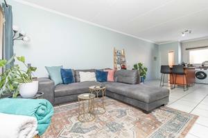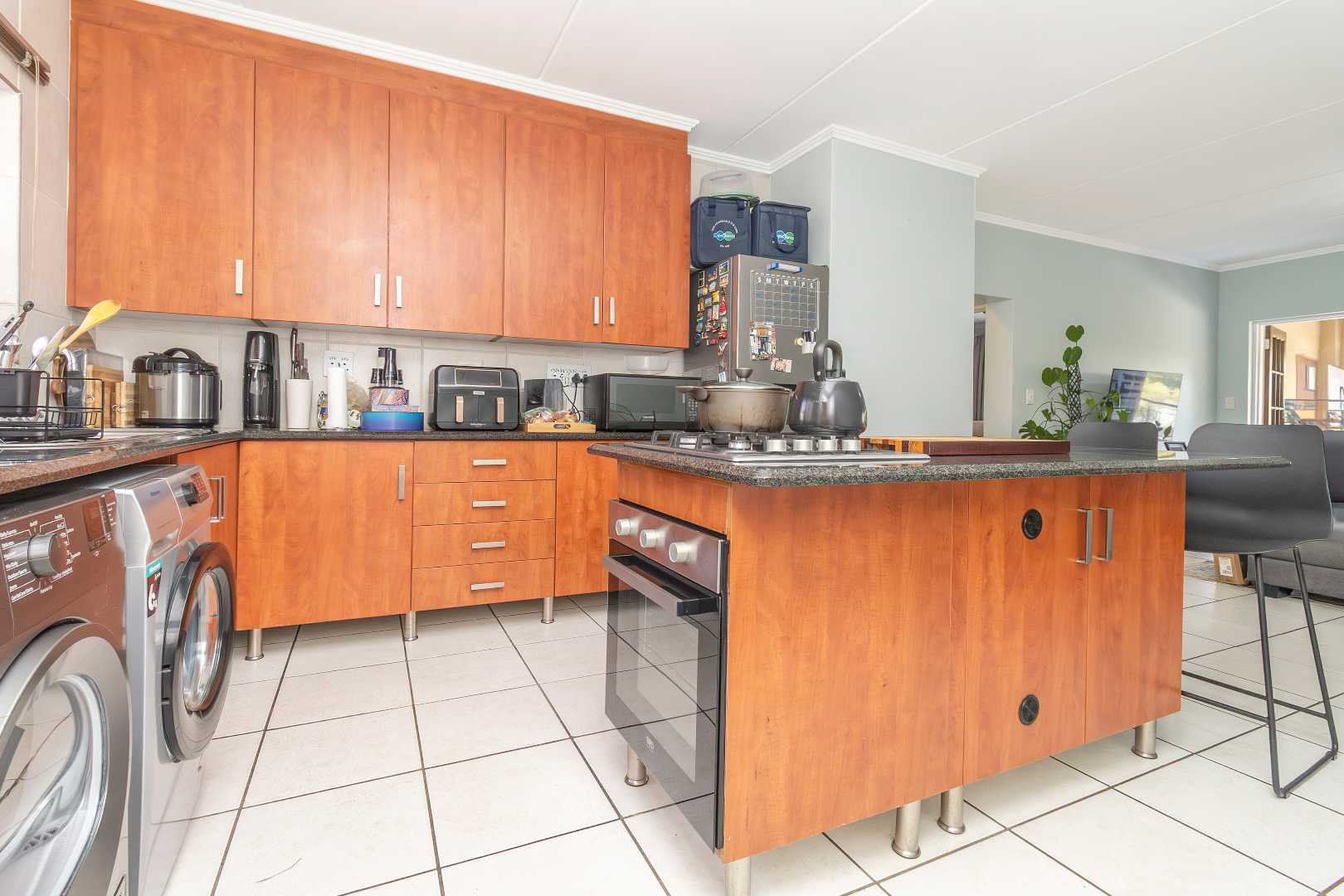 Step into the open-plan kitchen, featuring a stylish breakfast island, a gas stove, and ample cupboard space, with room for your fridge. The kitchen seamlessly flows into a well-sized dining and lounge area, creating the perfect space for entertaining. A door leads out onto the balcony, where you can enjoy your morning coffee or unwind in the evening.